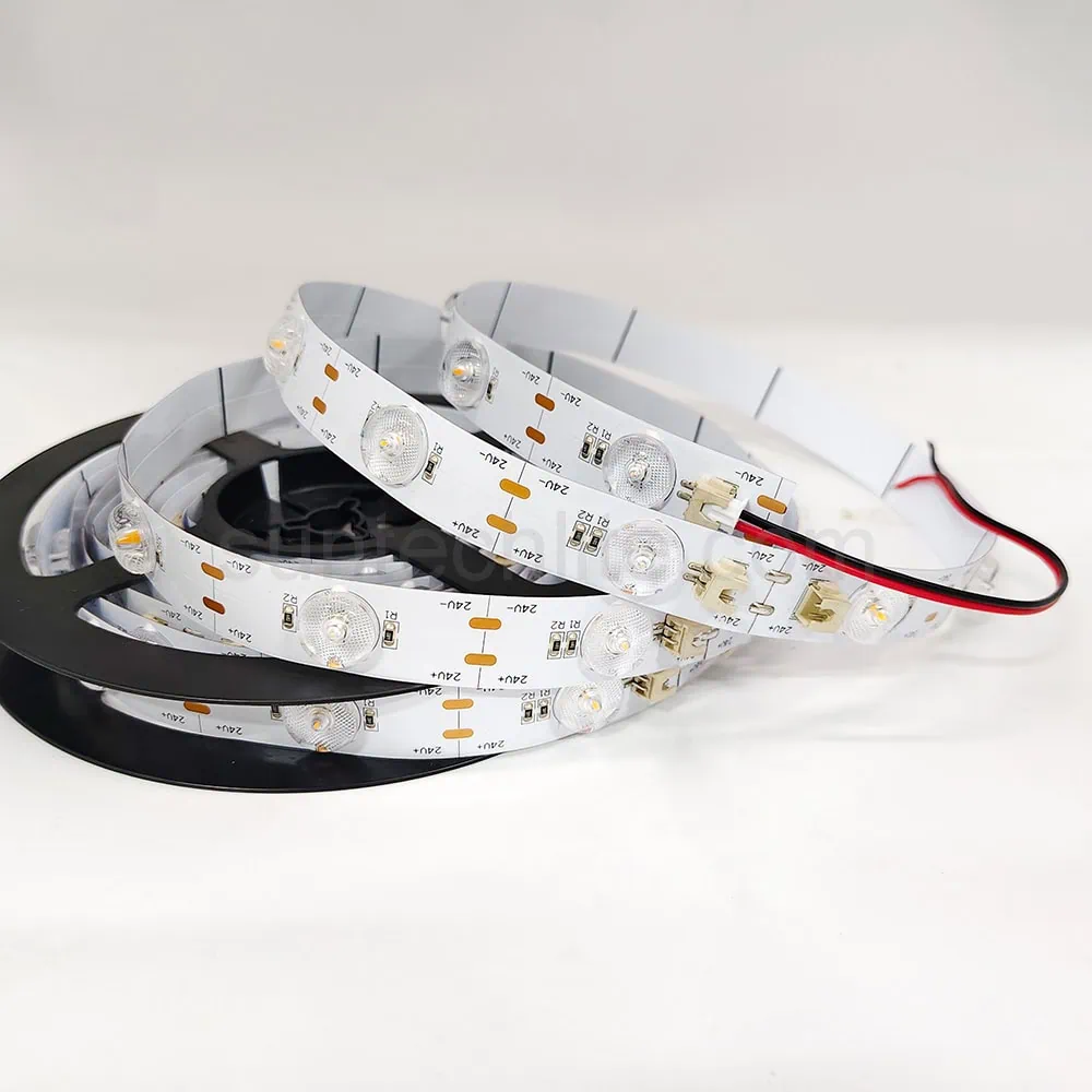 Simply put, a lens LED strip is a regular LED strip with a small “magnifying glass” (optical lens) added to each LED to change and optimize the way light is emitted.