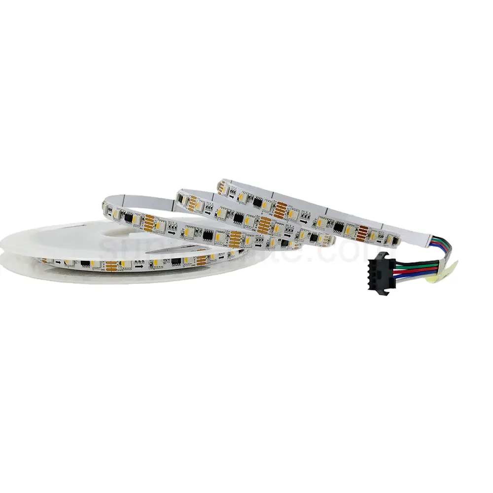 This is a RGBW addressable LED strip controlled by SK6812 IC, operating at a low voltage of 5V. There are 144 LED chips across each meter. High density ensures a bright and even RGB LED lighting, with various dynamic lighting modes. The RGBW led strip lights have a separate white chip channel, its white color is pure white, unlike RGB white which is bluish or purplish.